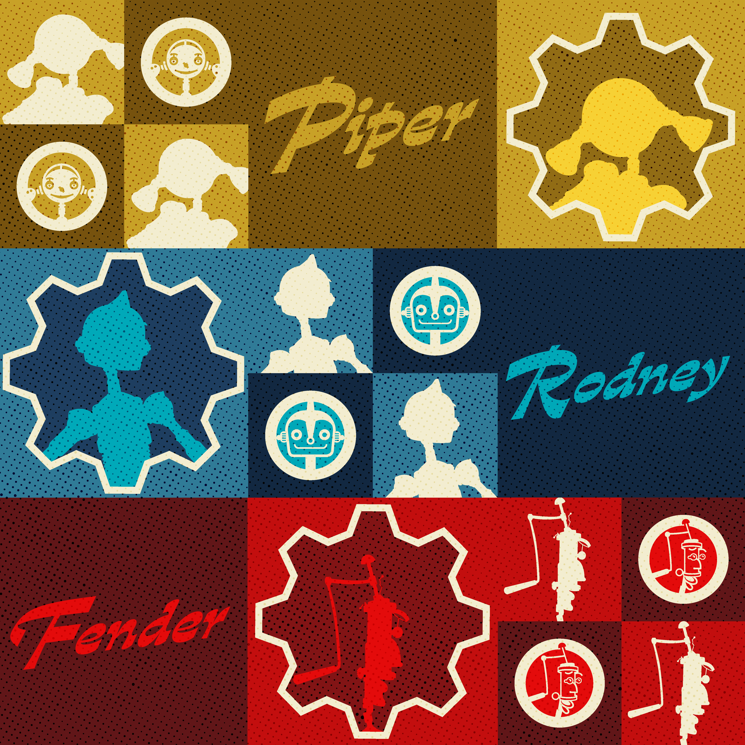 Create retro-style badges and patterns for the Robots movie anniversary. Use nostalgic elements like gears, cogs, and robot characters, with vibrant colors and vintage typography for a retro-futuristic feel.